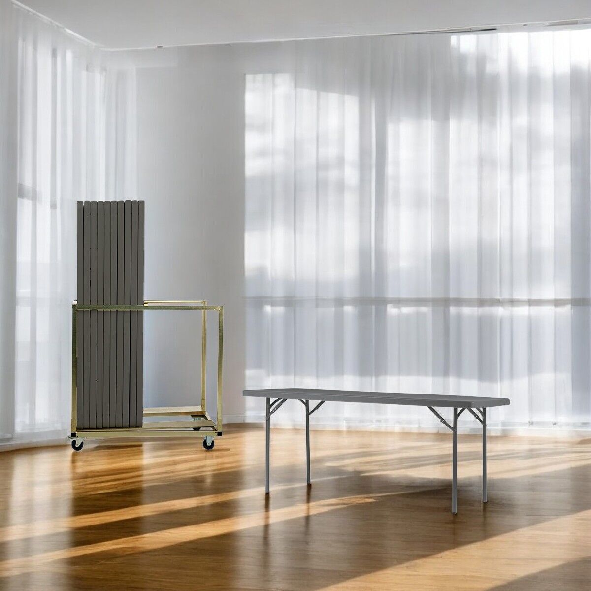 - Fleksibelt og funktionelt design: Med en længde på 180 cm og en bredde på 75 cm får du et alsidigt bord, der passer perfekt til både servering, møder og gruppearbejde. Bordene er nemme at klappe sammen og transportere.