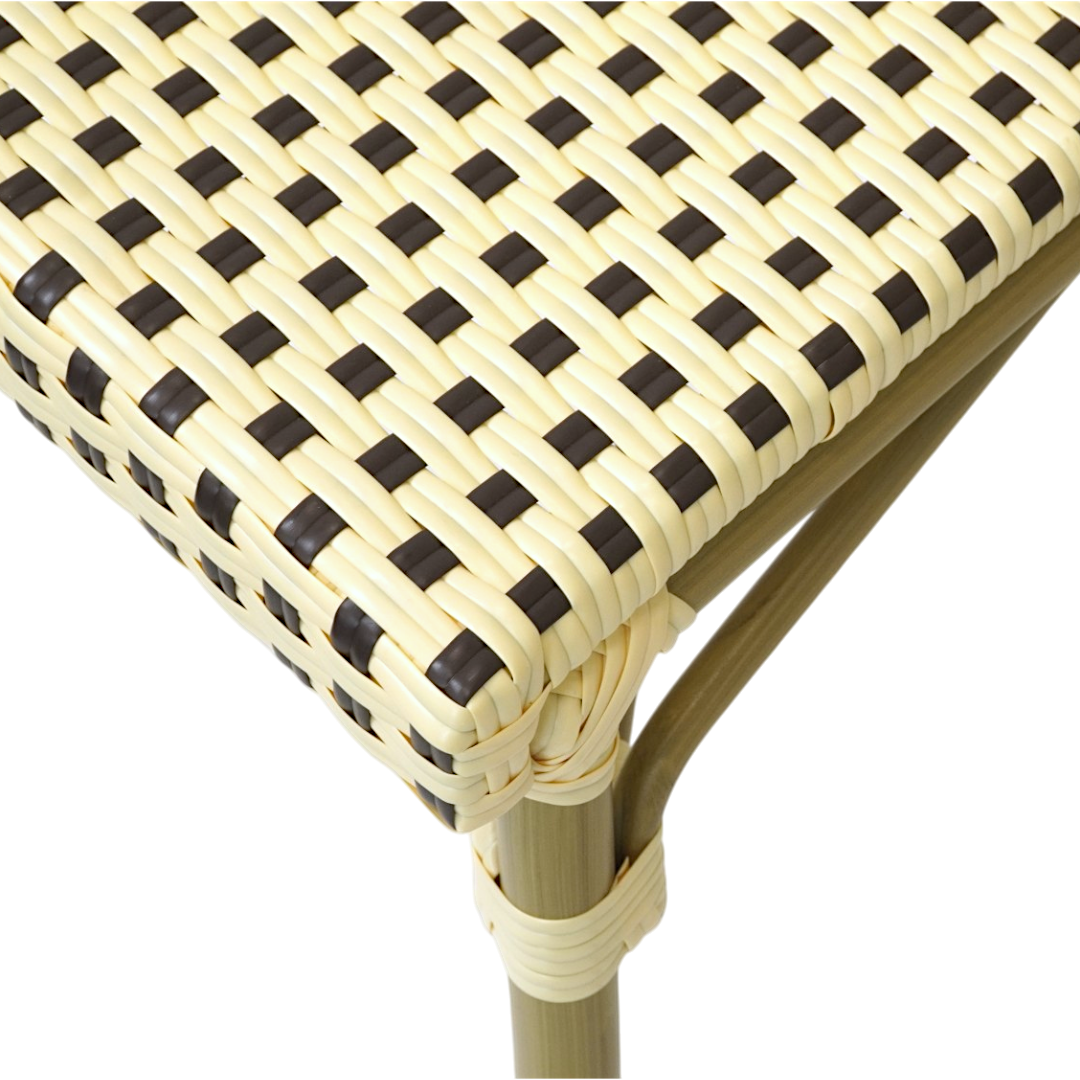 Elegant og klassisk stol med naturinspireret flet i brun og beige. Fremstillet i vejrbestandigt polyrattan og pulverlakeret stål. Stabelbar, komfortabel og perfekt til både inde- og udemiljøer.