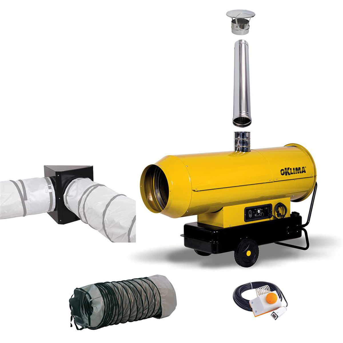 Varmluftovnen er let og kompakt. Den leveres samlet og komplet med trolley, skorsten, termostat, distributionsflange og 2 slanger med snapspændebånd.