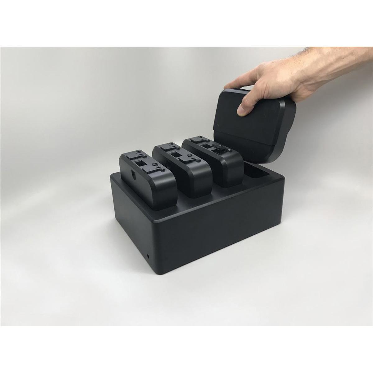 Oplader til 4 batterier og sikkerhedsnøgle til trådløs oplader til smartphones, som kan indbygges i visse bordplader.