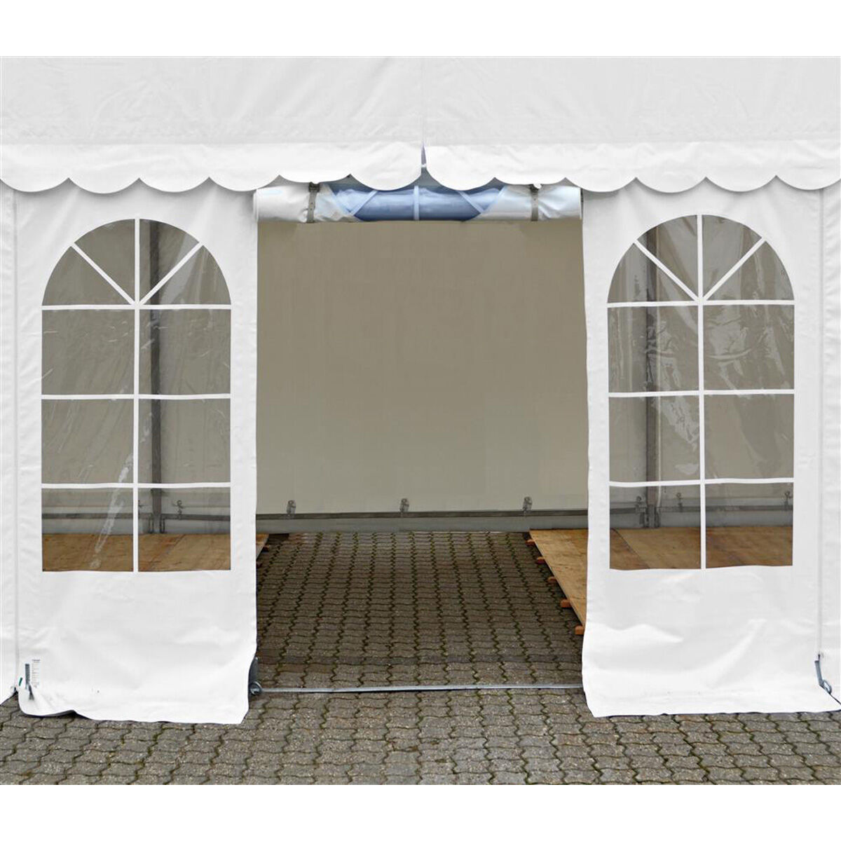 Kraftig sidedug med vinduer, dør og keder til partytelte.